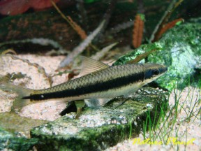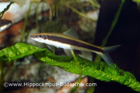In 2009 Tan and Kottelata described a new laterally-striped species, C. obscurus, from the Batang Hari river drainage in Sumatra. This species also grows relatively large (to “at least” 5.6″/14.2 cm) and is further distinguished as follows: “one pair of rostral barbels, no maxillary barbels; midlateral stripe with edges not sharply contrasted, slightly curved downward, obscured in largest individuals, continued on median caudal-fin rays, reaching posterior margin; no black mark between anus and anal fin; mouth wide (30-36% HL)”. It’s possible that this one has already appeared in the trade labelled with a different name.