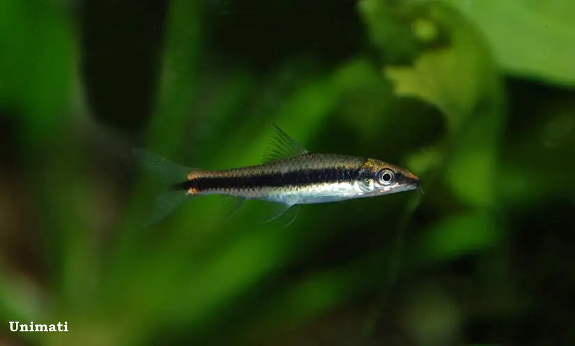 The black lateral stripe runs from the snout to the tip of the caudal fin; the eye is pale brown above the pupil and white below; maxillary barbels are not visible; the lateral line is curved; the fins are a pale dusky yellow colour. Depending on mood this species has the ability to change the appearance of the dark body stripe, most obviously during bouts of sparring when it becomes much broader and paler in colour.